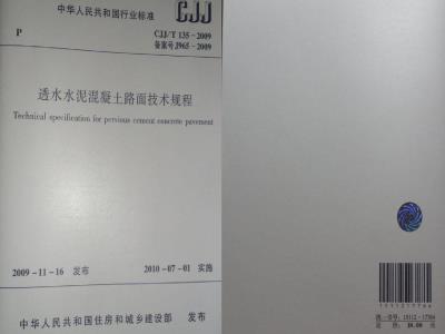 《透水水泥混凝土路面技术规程》的公告现批准《透水水泥混凝土路面技术规程》为行业标准,编号为CIJ/T135-2009,自2010年7月1日起实施。本规程由我部标准定额研究所组织中国建筑工业出版社出版发行。