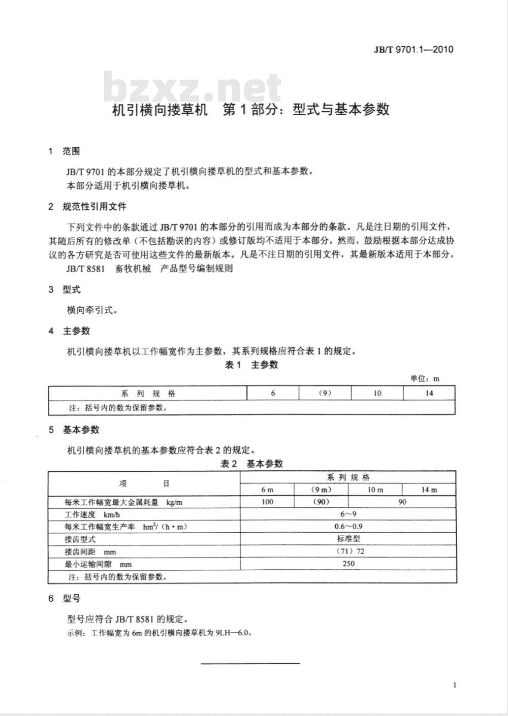 机引横向楼草机第1部分:型式与基本参数JB/T9701的本部分规定了机引横向楼草机的型式和基本参数。本部分适用于机引横向楼草机。规范性引用文件
