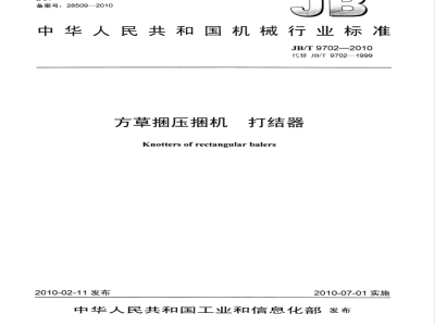 本标准代替JB/T9702—一1999《捡拾压捆机打结器技术条件》。本标准与JB/T9702一1999相比,主要变化如下:JB/T9702-2010