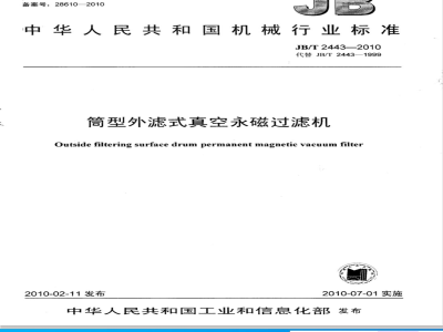 本标准代替JB/T2443--1999《筒型外滤式真空永磁过滤机》。本标准与JB/T2443一1999相比,主要变化如下:-补充了过滤机的结构型式,增加了产品规格,基本参数表中补充了滤饼含水量和处理量;-完善了过滤机的工作环境适应性要求;补充了涂漆质量要求及其检验方法:-补充了型式检验的判定规则;