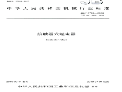 本标准规定了(JZC系列)接触器式继电器的术语和定义、符号、分类、特性、产品的有关资料、正常的使用、安装和运输条件、结构和性能要求、试验等。本标准适用于(JZC系列)接触器式继电器,包括JZC1系列、JZC2系列、JZC3系列、JZC4系列。该继电器在交流50Hz(或60Hz)、电压至660V,直流电压至220V的控制电路中,作为信号放大或将信号传递给有关控制元件之用,除符合本标准规定的使用类别外,还应符合交流接触器的使用条件和部分性能。各系列继电器的派生品种或规格,可由制造厂制定符合本标准通用要求的产品标准(即企业标准)。 JB/T 8792-2010 接触器式继电器 JB/T8792-2010 标准下载解压密码:www.bzxz.net