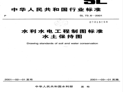 《水利水电工程制图标准水土保持图》SL73.6—2001。本标准自2001年3月1日起实施。在实施过程中,请各单位注意总结经验,如有问题请函告主持部门,并由其负责解释。标准文本由中国水利水电出版社出版发行。二0O一年二月一日