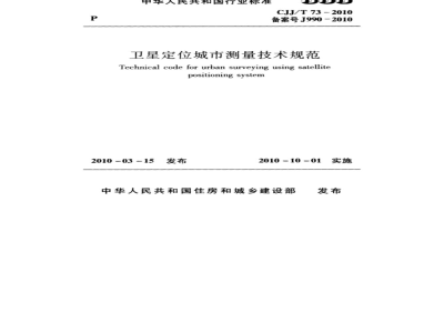 《卫星定位城市测量技术规范》的公告现批准“卫星定位城市测量技术规范》为行业标准,编号为CJT73-2010.自2010年10月1日起实施。原行业标准《全球定位系统城市测量技术规程》CJ73-97同时废止,本规范由我部标准定额研究所组织中国建筑工业出版社出版发行。