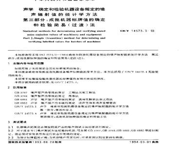 Statistical methods for determining and verifying statednoise emission values of machinery and equipmentPart 3:Simple (transitlon) method for determining andverifying lahelled values for butches pf machinesGB/T14573.3-93