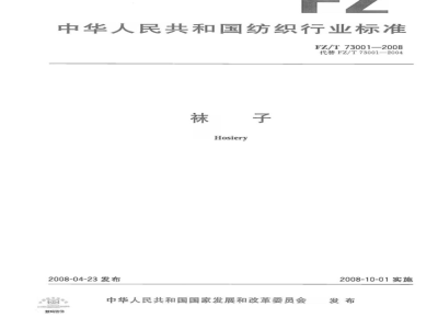增加了耐水色牢度、可分解芳香胺染料、异味、耐唾液色牢度等检测项目及要求;耐湿摩擦色牢度增加“深色2一3级”;外观质量抽样数量由20双改为15双;内在质量抽样数量由10双改为5双。一对产品包装及产品使用说明内容进行了调整。本标准由中国纺织工业协会提出。本标准由全国纺织品标准化技术委员会针织品分会归口。本标准负责起草单位:国家针织产品质量监督检验中心、苏州华钟针织有限公司、浙江浪莎针织有限公司、浙江丹吉娅集团、浙江梦娜针织袜业有限公司、浙江宝娜丝袜业有限公司、广东中山丰华袜厂有限公司、浙江情怡袜业有限公司、南海合兴袜业制衣有限公司、浙江耐尔集团有限公司。本标准参加起草单位:浙江双双袜业有限公司、浙江步人针织有限公司。本标准主要起草人:刘风荣、袁青、董汉良、张岩峰、翁荣金、洪冬英、黄丽霞、黄立新、丁汉林、薛学正、易启彬、史吉刚、寿国理、周秀美。本标准所代替标准的历次版本发布情况为:FZ/T73001—1991,FZ/T73001—2004。I