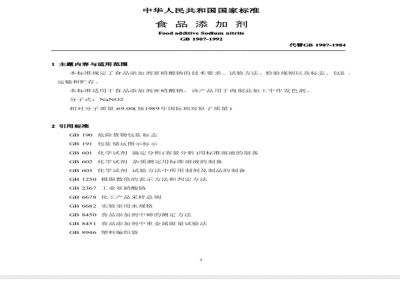 本标准主要起草人周巧娥、高宏、戴滢。本标准参照日本食品添加物公定书第五版(1986年)亚硝酸钠标准。国家技术监督局1992-11-03批准11