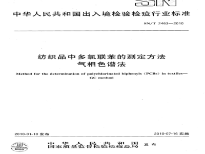本标准规定了纺织品中多氯联苯(PCBs)的气相色谱测定方法。SN/T2463-2010