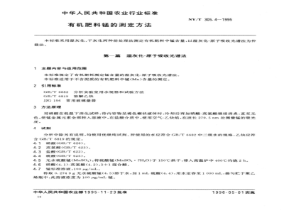 NY/T 305.1~305.4-1995 有机肥料铜、锌、铁、锰的测定 [合订本] NY/T305.1~305.4-1995 标准下载解压密码:www.bzxz.net