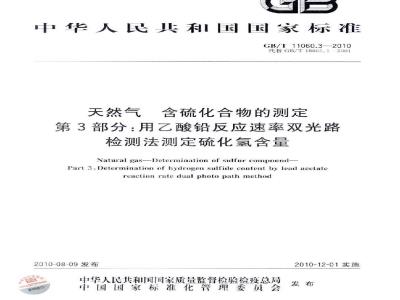GB/T11060天然气含硫化合物的测定》分为以下五个部分:第1部分:用碘量法测定硫化氢含量:第2部分:用亚甲蓝法测定硫化氢含量:一第3部分:用酸铅反应速率双光路检测法测定硫化氢含量:一第4部分:用氧化微库仑法测定总硫含量:第5部分:用氧解-速率计比色法测定总硫含量。本部分为GB/T11060的第3部分。GB/T11060.3—2010