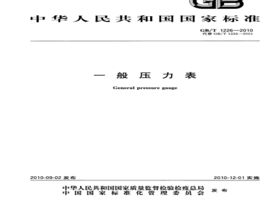 本标准代替GB/T1226—2001《一般压力表》,本标准与GB/T1226—2001相比,主要变化如下:标准的编写格式按GB/T1.1一2000的要求进行了修改;扩大了标准的适用范围,将不锈钢压力表、异型外壳的仪表纳入本标准;扩大了仪表的测量范围;