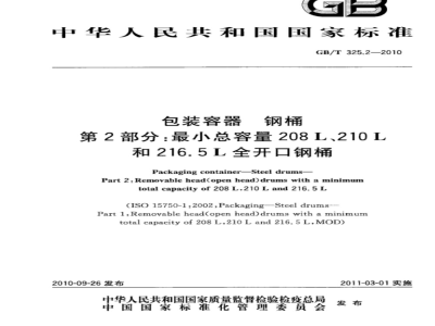 GB/T 325的本部分规定了最小总容量为208L、210L和216.5L全开口钢桶的结构和尺寸。