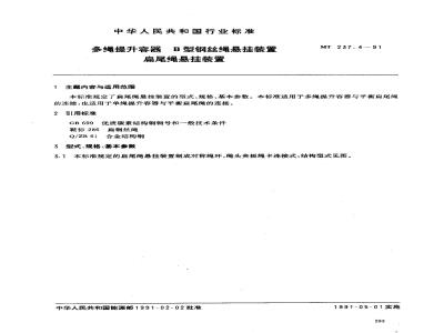 3.1本标准规定的扁尾绳悬挂装置制成对称绳环、绳头夹板绳卡连接式,结构型式见图。中华人民共和国能源部1991-02-02批准1991-05-01实施
