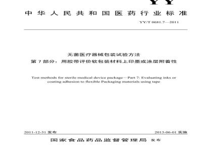 第7部分:用胶带评价软包装材料上印墨或涂层附着性Test methods for sterile medical device package-Part 7: Evaluating inks orcoating adhesion toflexiblePackaging materials using tape2011-12-31发布