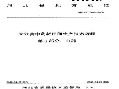为了更加科学合理地预防和治理无公害中药材生产过程中病虫害的发生和危害,实现无公害中药材的安全生产,保证中药材产品的质量,保护我们人类的健康,特制订无公害中药材田间生产技术规程》系列标准。DB13/T758无公害中药材间生产技术规程》分为7个部分:-第1部分:白米: