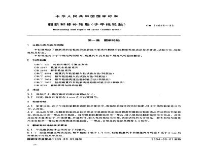 本标准规定了翻新用的旧轮胎的选胎技术要求和翻修后的翻新轮胎成品技术要求、试验方法、检验规则及标志。本标准适用于子午线结构的轿车、载重汽车及其挂车用充气轮胎的翻新。 GB 14646-1993 翻新和修补轮胎(子午线轮胎) GB14646-1993 标准下载解压密码:www.bzxz.net