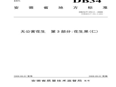本部分自2008年8月1日起实施。本标准代替DB34/T252.4-2003。原标准于2003年首次发布,2008年修订时将DB34/T252.1-2002废除。DB34/T252.1-2008代替DB34/T252.2-2002:DB34/T252.2-2008代替DB34/T252.3-2002;DB34/T252.3-2008代替DB34/T252.4-2003;DB34/T252.4-2008代替DB34/T252.5-2003。《无公害花生》共由四部分组成,每一个部分均为独立。本部分是无公害花生的第3部分,其它部分为: