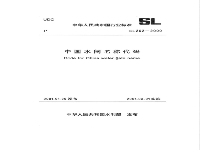 SL262一2000《中国水闸名称代码》主要包括以下内容:水闸编码的目的、原则,编码的对象、方法;一水名称代码格式及代码各要素内容;水闸编码中一些问题处理说明及术语注释;全国各流域水闸名称代码。