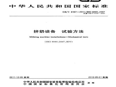 一增加了真空系统调节待性测试、挤奶管道坡度、奶杯口深度和内套有效长度的测定。本标准来用翻译法等局采用国际标准ISO6690,2007挤奶设备试验方法》英文版)。本标准由中国机械工业联合会提出。本标准由全国农业机械标准化技术委员会(SAC/TC201)归口。本标准起草单位:中国农业机械化科学研究院、农业部农业机械试验鉴定总站。本标准主要起草人,皇才进、陈俊宝、陈风歧、李伟、齐惠昌。本标准所代替标准的历次版本发布情况为:--CB/T8187—1987,GB/T8187—2005.1范围