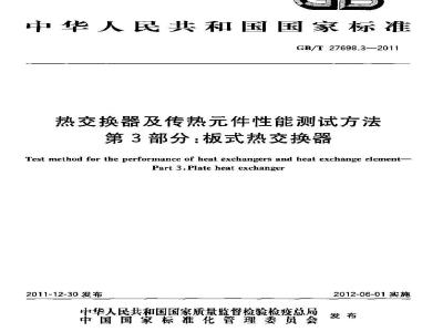 GB/T27698的本部分规定了板式热交换器液-液无相变、汽-液冷凝有相变,汽-液热发有相变测试工况(包括半焊板式热交换器,全焊板式热交换器)的传热和流体阻力性能测试方法,本部分适用的测试流体为液体-液体、蒸汽-液体。本部分贝考虑传热板材料导热热阻,未考虑传热板两測污垢热阻。按本部分规定测试的板式热交换器的板片数应不少下7片。2规范性引用文件