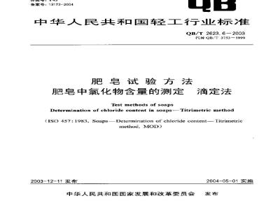 QB/T2623.1肥电试验方法肥皂中游离苛性碱含量的测定Q3/2623.2肥电试验方法肥皂中总游离碱含量的测定QB/T2623.3肥皂试验方法肥卓中总碱量和总脂肪物含量的测定QB/T2623.4肥皂试验方法肥皂中水分和挥发物含单的测定烘箱法QB/T2623.5肥皂试验方法肥皂中乙醇不落物含量的测定QB/T2623.6肥皂试验方法肥皂中氯化物含量的测定滴定法QB/T2623.7肥卓试验方法肥皂中不皂化物和术皂化物的测定QB/T 2623.8吧皂试验方法肥皂中磷酸带含量的测定本标准是对QB/T3753一1999(肥皂中氯化物含量的测定滴定法》的修订。本标推修改采用1S0457:1983肥皂氯化物含量的测定滴定法》(英文版)。本标准根据IS0457:1983重新起草,根据我国国情和实验验证,本称准在采用国际标准时进行了以下技术性修改:a)以重复性表示精密度代替IS0457:1983中以再现性表示精密度,为便于使用,本标准做了下列编辑性修改:a)“本国际标雅”一词改为“本标雅\;b)用小数点“,”代替作为小数点的逗号“,”;c)删除国际标准的前言。