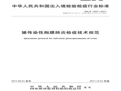代替SN/T1447.1-—2004,SN/T1447.2—2005猪传染性胸膜肺炎检疫技术规范Quarantine protocol for infectious pleuropneumonia of swine2011-05-31发布