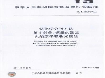 本部分按照GB/T1.1一2009给出的规则起草。本部分代替YS/T281.8-1994《钻化学分析方法火焰原子吸收光谱法测定镉量》。与YS/T281.8-1994相比,本部分主要有如下变化分析下限由原来的0.0002%扩充至0.00010%;对文本格式进行了修改,补充了质量保证和控制条款,增加了重复性限和再现性限;补充了对试验报告的要求。