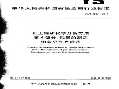 Methods for chemical analysis of laterite nickcl ores-Part 4:Determination of phosphorus content-Phosphorus molybdenum blue spectrophotometry2012-11-07发布