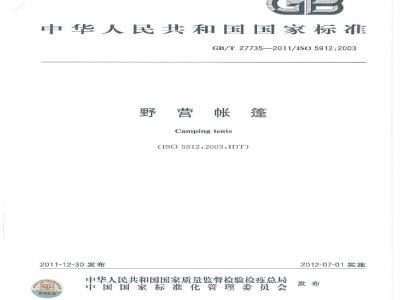GB/T27735—2011/ISO5912:2003本标准规定了野营帐篷(以下简称帐篷)要求,测试、使用说明及标识。本标准适用于3.1定义的以野营及户外为目的的各类帐篷。注:对于大篷车篷布参见ISO8936以及ISO8937。野营帐篷和大篷车篷布的有关术语见ISO71522规范性引用文件