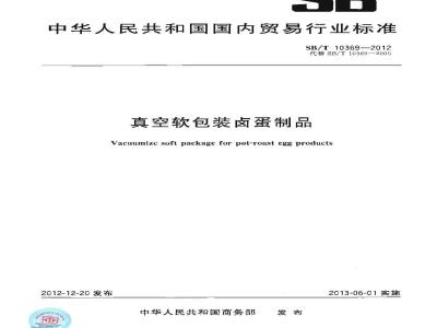 增加了GB28050预包装食品营养标签通则\的规定;取消卫生指标列表明示值,改为应符合GB2749的规定;明确「加工过程要求应符合GB/T25009,2C10的规定;修改了对“真空钦包装卤蛋制品的括述”;对检验规则和判定规则作了体表述。本标准按照GB/T 1.1一20C9给出的规贮起草。本标推由中国商业联合会提出。本标准中华人民共和国商务部归口,SB/T10369—2012