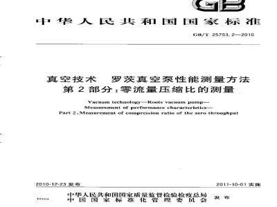 GB/T25753《真空技术罗茨真空泵性能测量方法》分为三个部分:一第1部分最人允许压差的测量;一第2部分零流量压继比的测量;第3部分溢流阀压差的测量
