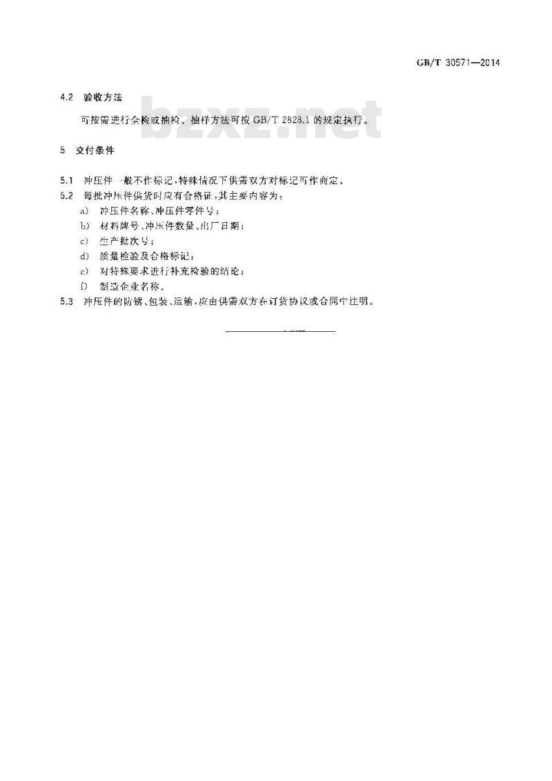 5.1冲压件-般不作标记,特殊情况下供需双方对标记而作商定。5.2每批冲床件供货时应有合格证,其主要内容为:a)济压件名称.冲压件零件号;6)材料牌号,冲乐件数量、比厂日期:c)生产批次号;