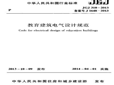 任房城乡建设部关于发布行业标准《教育建筑中气设计规范》的公告现批推教育建筑电气设订融范为行业标准,缩与为G310:2013,自2014年4月1口起实施。其中,第4.3.3、5.2.4条为独制性条文,必须严格执行本规范内我部标准定额研究所组织中国建筑工业出版社出版发行。