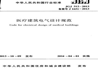 住房城乡建设部关于发布行业标准《医疗建筑电气设计规范》的公告现批准《医疗建筑电气设计规范》为行业标准,编号为JGJ312-2013,自2014年4月1日起实施。其中,第7.1.2、9.3.1条为强制性条文,必须严格执行。本规范由我部标准定额研究所组织中国建筑工业出版社出版发行。