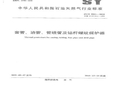 本标准依据GB/T1.1-2009《标准化工作导则第1部分:标准的结构和编写》给出的规则缅本标准代替5YT5991—1994《套管、汕管和输送管螺纹保护器》。本标准主要根据AP1Spec5CT:2006《套管和油箭规范》(第8版)的相应变化情况,并结合钻杆螺纹保控器的生严使用情况,对SYT59911994进行了修让:太标准与SY/T5991—1994剂比,主要技术差异如: