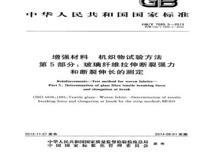GB/T7689的本部分规定了玻璃纤维机织物拉伸断裂强力和断裂伸长的测定方法。本方法适用于未浸渍的和用浆料或硬化剂浸渍的织物,不适用于涂覆橡胶或塑料的织物(参见附录A)。