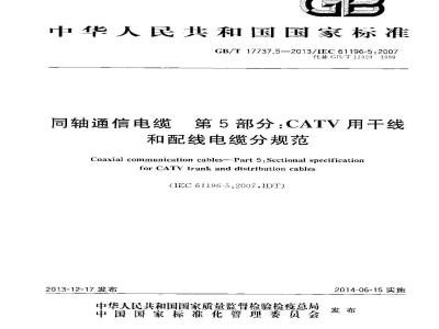 一第5部分:CATV用十线和配线电缆分规范。本部分为(B/T17737的第万部分本部分按照GB/T1.1一2009给出的规则起草,本部分代替了GB/T113231989%电缆分配系统用单同轨电缆一般要求和试验》。本部分与GB/T113231989相比,主要技术变化如下,雅名称改为同轴道信电缆第5部分:(:ATV用线和配线电缆分规范”:频率范围由\30 MH2~960 MHz\护人到5 MHz~-1 0c0 MHz”;用-J(GB/T11323:981中用的大部分标准在GB/T17737,1~20CC预布后已被代替掉,因此本部分与GB/T11323:1989作结构内容和试验方法上有较大收动。本部分使用翻译法等同采用IEC:61196-5:2007《同轴通信电缆第5部分:CATV印干线和配线电缆分规范》,