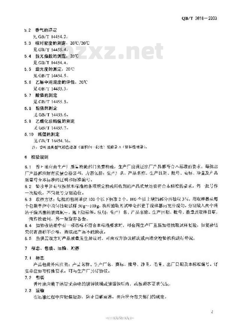 本标准规定了香叶油的要求、试验方法、检验规则和标志、包装、运输、贮存。本标准适用于对以香叶天竺葵的新鲜茎、叶为原料,经水蒸气蒸馏制得的香叶油的质量进行分析评价。 QB/T 2616-2003 香叶油 QB/T2616-2003 标准下载解压密码:www.bzxz.net