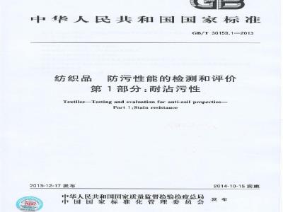 GB/T30159《纺织品防污性能的检测和评价》包括以下2个部分:第1部分:耐沾污性,
