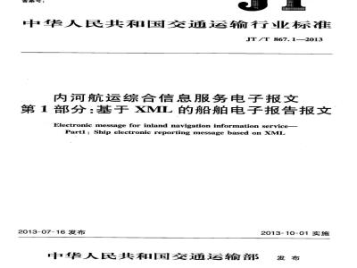 JT/T867—2013《内河航运综合信息服务电子报文》分为三部分:第1部分:基于XML的船舶电子报告报文:第2部分:基于XML的船员/乘客清单报文;第3部分:基于XML的航行通告与航行警告报文。本部分为JT/T867--2013的第1部分。本部分按照GB/T1.1—2009给出的规则起草。本部分参考联合国用于行政、商业、运输业的国际危险品运输通知电子数据交换标准(UN/EDI-FACTIFTDGND.98B)以及欧洲经济局内河运输委员会内河水运工作组于2007年通过的第60号决议《内河运输国际标准-