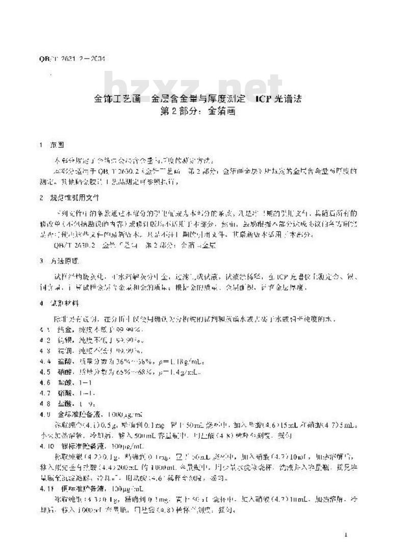 本部分规定了金箔画金层含金量与厚度的测定方法。本部分适用于QB/T2630.2《金饰工艺画 第2部分:金箔画金层》所规定的金层含金量与厚度的测定。其他贴金胶片工艺品测定可参照执行。 QB/T 2631.2-2004 金饰工艺画?金层含金量与厚度测定ICP光谱法?第2部分:金箔画 QB/T2631.2-2004 标准下载解压密码:www.bzxz.net