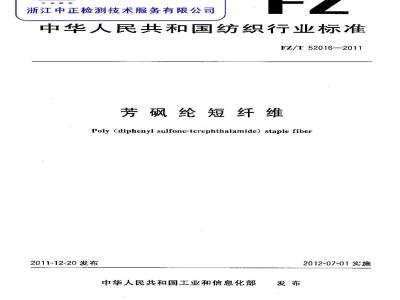 本标准按照GB/T 1.1—2009 给出的规则起草,本标准由中国纺织工业协会提出。本标由上海市纺织工业技术监督所归口。本标准起草单位:上海特安纶纤维有限公司、上海市纺织工业技术监督所。本标准主要起草人:陈晟晖、汪晓峰、陆秀琴、孙建忠、李红杰。FZ/T 52016—2011