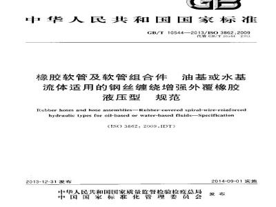 本标准按照GB/I1.12009给出i的规则起草,GB/T 10544--2C13/IS0 3862:2009本标准代替GB/T1C544一2003钢丝缠绕增强外爱橡胶的液压橡胶软管和软管组介件》,与GB/T10544一2003 相比,主要技术变化如下删除了不适用于范麻油基和脂基流体的规定(见第1章,2003年版的第1章);增加术讲和定义(见第3章)