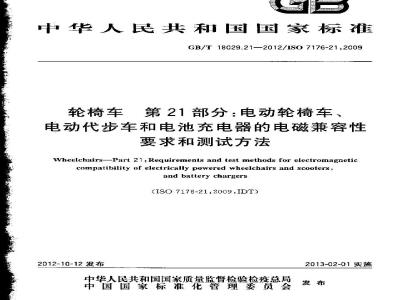 GB/T18029.21-2012/IS0 7176-21:2009电动轮椅车的行驶及其电池充电器的运行不能给环境带来明显的电磁骊扰,反之,正常使用中出现的电微骚扰也不能明显降低其性能。由于轮椅车经常在道路行驶,因此需对固定的或移动的通信设备及其他电磁骚扰源发出的射频场具有抗扰性。轮椅车意外运动或变向,可引发伤害事故。GB/T18029的本部分规定了轮椅车及其电池充电器的要求和测试方法,在通常使用环境中,轮椅车及其电池充电器可将暴露于合理可预见的电磁干扰和静电放电有关的风险,产生损坏其他设备或仅器运行的电磁场有关的风险降到最小。根据轮椅车使用环境和相关风险,确定射频辆射抗扰度要求的频率上限和试验等级。为此,轮椅车行驶要求与其用作医疗设备的要求一致,但是,充电要求与用作家用电器设备的要求一致。m