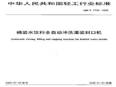 本标准规定了桶装水饮料全自动冲洗灌装封口机的定义、要求、试验方法、检验规则和标志、包装、运输、贮存。本标准适用于聚碳酸酯(PC)桶装水饮料全自动冲洗灌装封口机。本标准适用于生产能力为60桶/h~1000桶/h,灌装容积为10L~20L,灌装物料为饮用矿泉水、纯净水、矿化水、天然净水等。 QB/T 2736-2005 桶装水饮料全自动冲洗灌装封口机 QB/T2736-2005 标准下载解压密码:www.bzxz.net