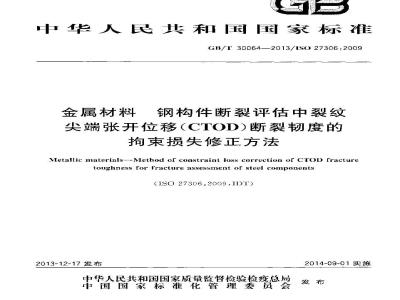 GB/T30064—2013/IS027306:2009金属材料钢构件断裂评估中裂纹尖端张开位移(CTOD)断裂韧度的拘束损失修正方法