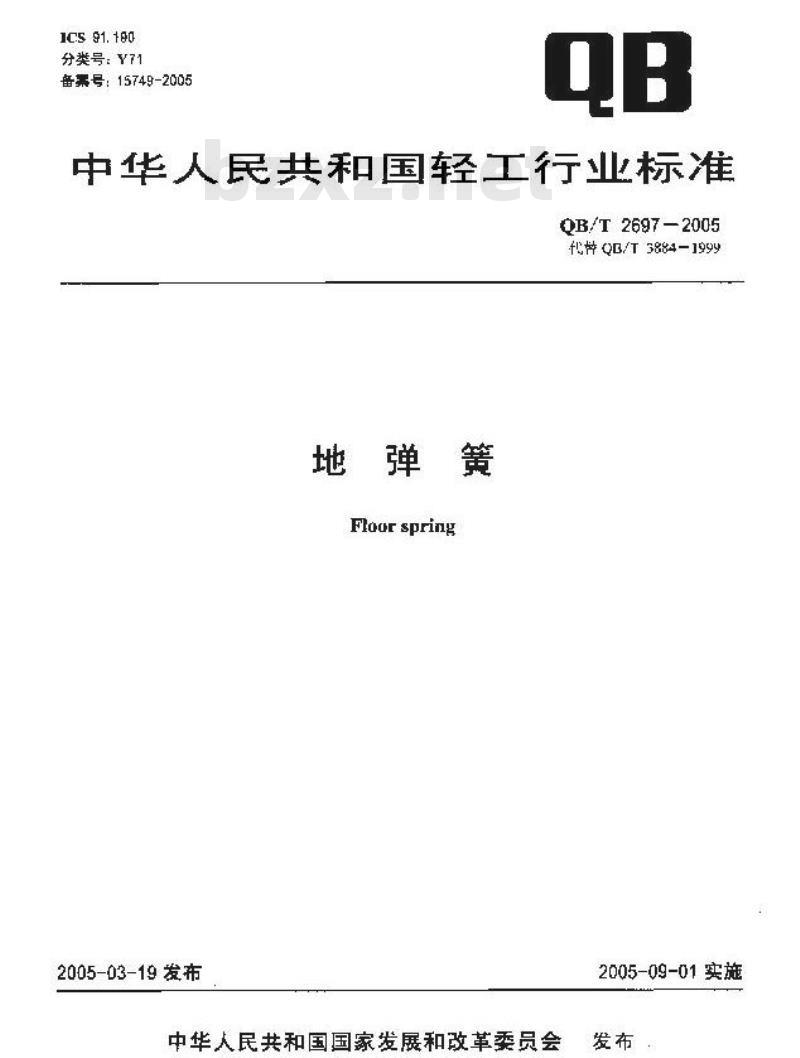 本标准规定了地弹簧的产品分类、要求、试验方法、检验规则和标志、包装、运输、贮存。本标准适用于安装在平开门扇下可单、双向开门、使用温度在-15℃~40℃、由金属弹簧、液压阻尼组合作用的各种地弹簧。 QB/T 2697-2005 地弹簧 QB/T2697-2005 标准下载解压密码:www.bzxz.net