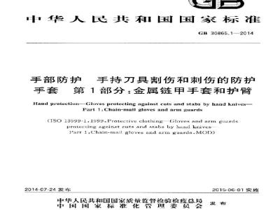 GB30865的本部分规定了金同链甲手套和护臂的式样、技术要求、测试方法,标识和制造商应提供的信息。