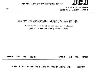 住房城乡建设部关于发布行业标准《钢筋焊接接头试验方法标准》的公告现批准《钢筋焊接接头试验方法标准》为行业标准,编号为JGJ/T27-2014,自2014年12月1日起实施。原《钢筋焊接接头试验方法标准》JGJ/T27-2001同时废止。本标准由我部标准定额研究所组织中国建筑工业出版社出版发行。