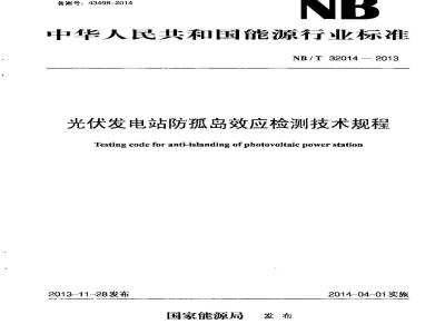 光伏发电站防孤岛效应检测技术规程本标准规定了光伙发电系统防孤岛效应的检测条件,检测设备和检测方法等。NB /T 32014—2013