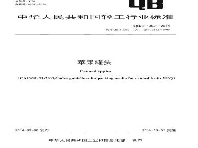 本准代替QBT3612一1999“糖水苹果醋头》、QB/T1392—1991《千装苹果罐头》:与原行业准机比,除编辑性修改外主要技术变化如下:-孙准名称修改为“苹果罐头”;扩人标准适月范围并调整相应分类和要求;将产品质量等级修订为“优级品和合格品:一在原料要求中增加食品添加剂和营养强化剂求:-修改产品固形物含量、可溶性固形物含量要求:除“缺陷”要求,在感言要求中增加“杂质”要求本际准参考国际食品法典委员会(CAC)CAC/GI.51-2(03《水果罐头装罐介质导则》(英文版)编制,与CAC/GL51-2003的一致性程度为非等效,本标准由中国轻工业联合会提出.本标准由全国食品发酵标准化中心汇口。本标准起草单位:中国食品发酵工业研究院、中国罐头工业协会、徐州人丰食品有限公司、大连真心罐头食品有限公司。